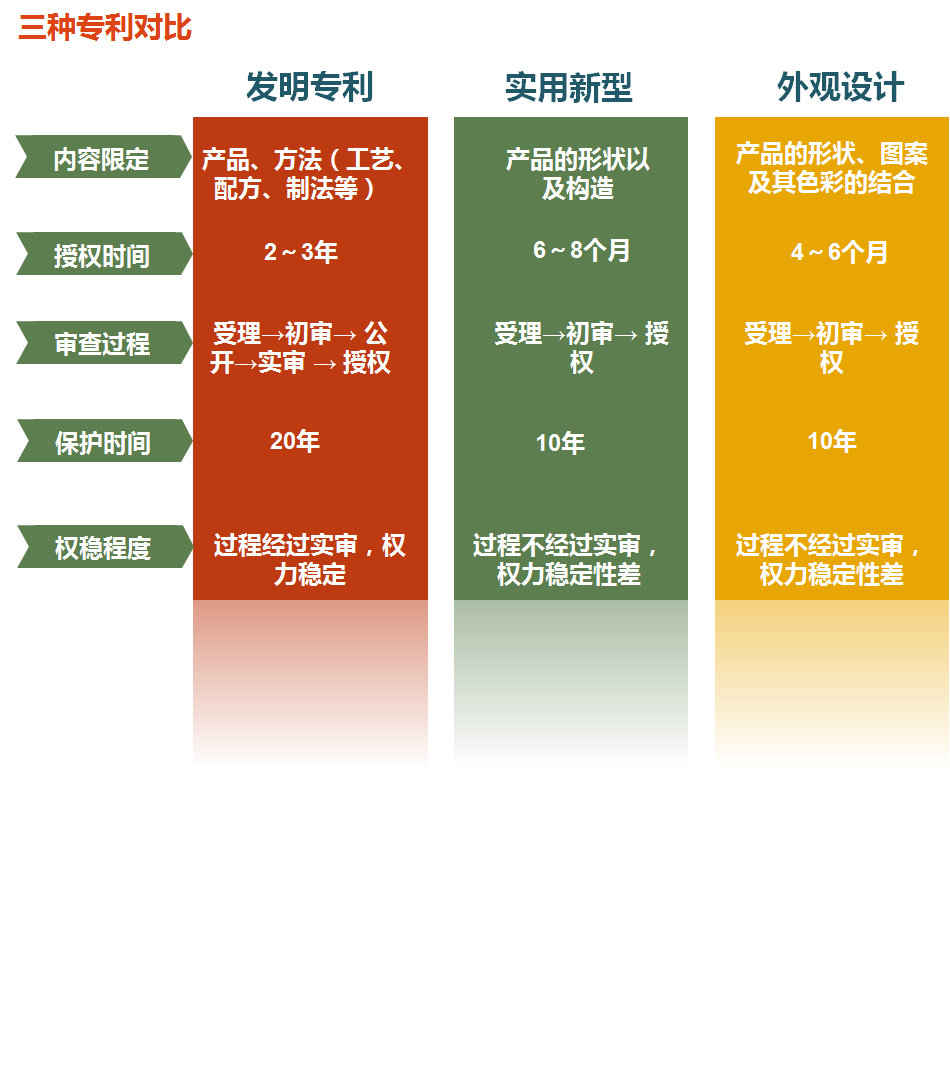 發(fā)明,是指對產(chǎn)品、方法或者其改進(jìn)所提出的新的技術(shù)方案;實(shí)用新型,是指對產(chǎn)品的形狀、構造或者其結合所提出的適于實(shí)用的新的技術(shù)方案;外觀(guān)設計,是指對產(chǎn)品的形狀、圖案或者其結合以及色彩與形狀、圖案的結合所作出的富有美感并適于工業(yè)應用的新設計。
