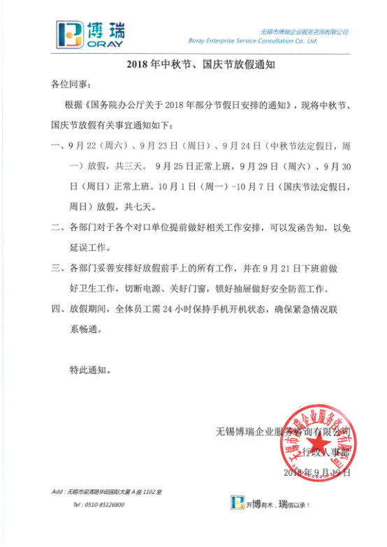2018年中秋節、國慶節放假通知